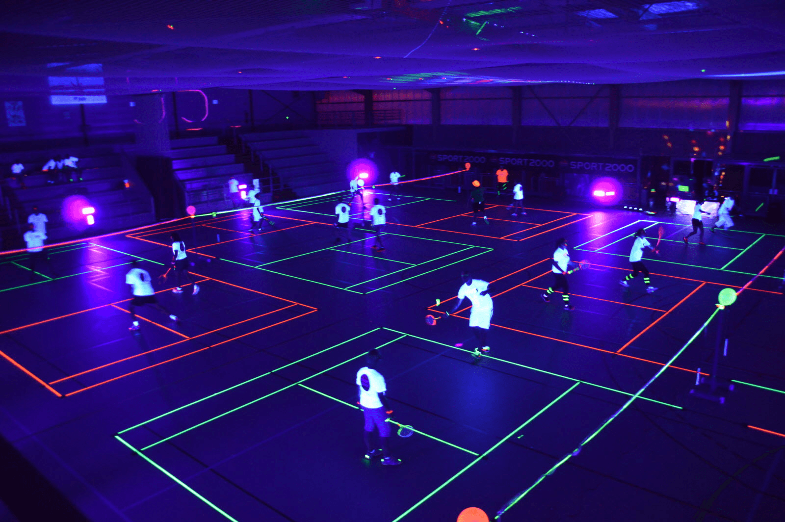 Place au badminton dans le noir, avec équipements fluorescents et ambiance néon !